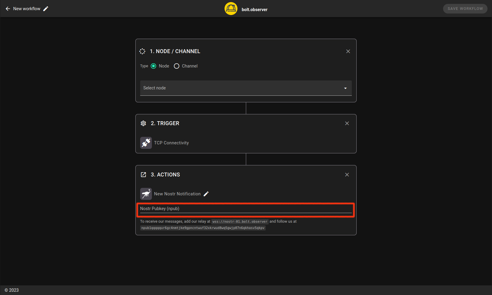 When creating a workflow on bolt.observer, enter your nostr public key in npub format in the designated "Nostr Pubkey (npub)" field as shown below: